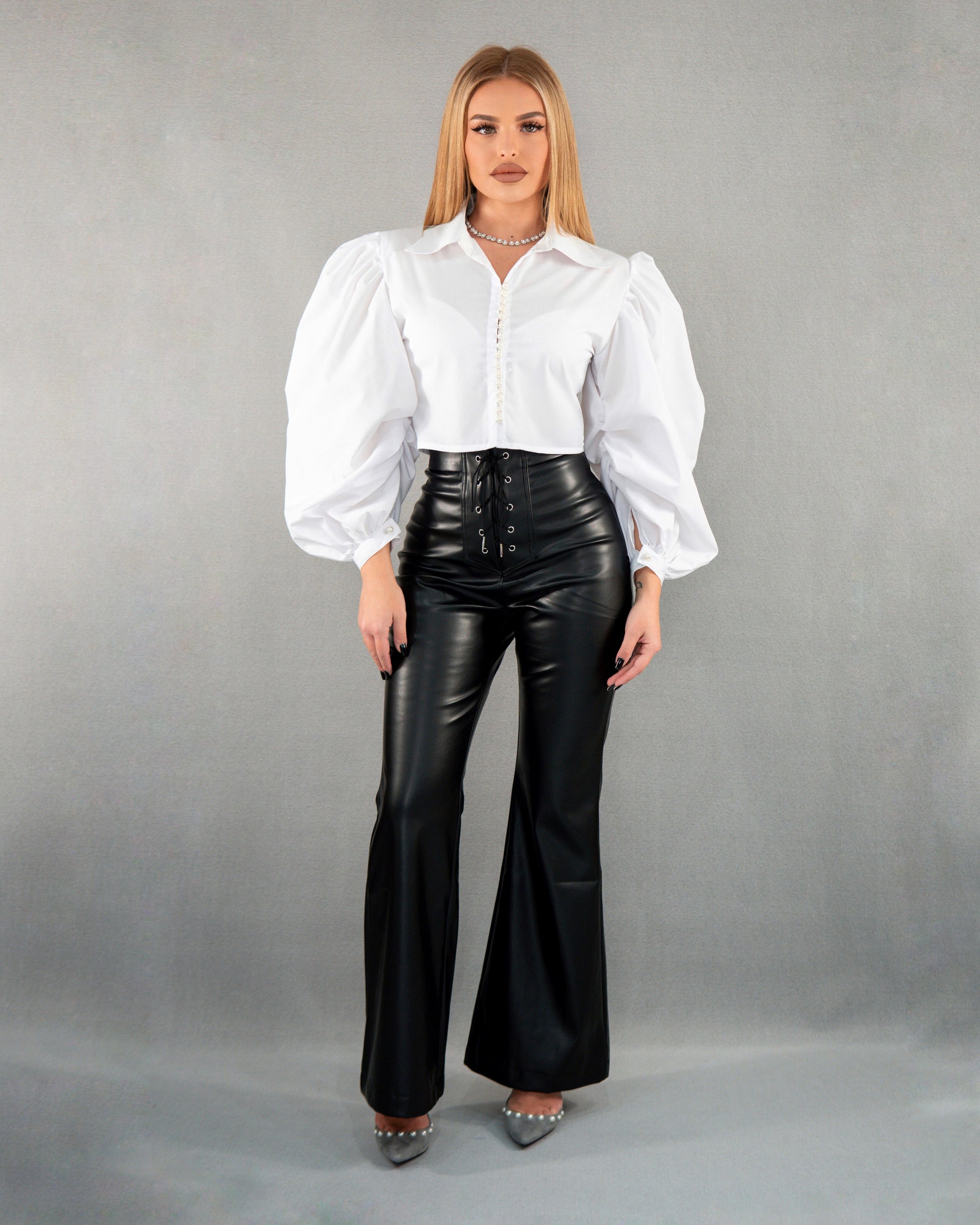 Cămașă scurtă cu perle și mâneci bufante - alb