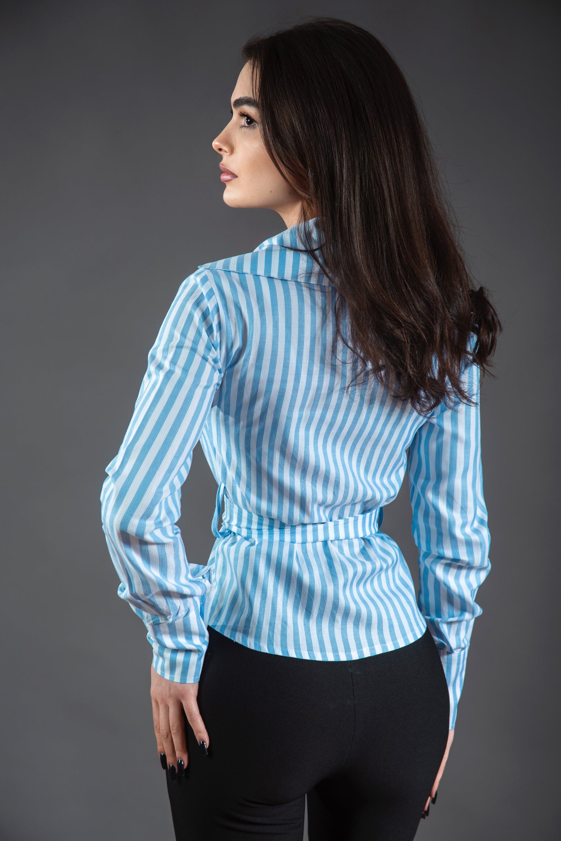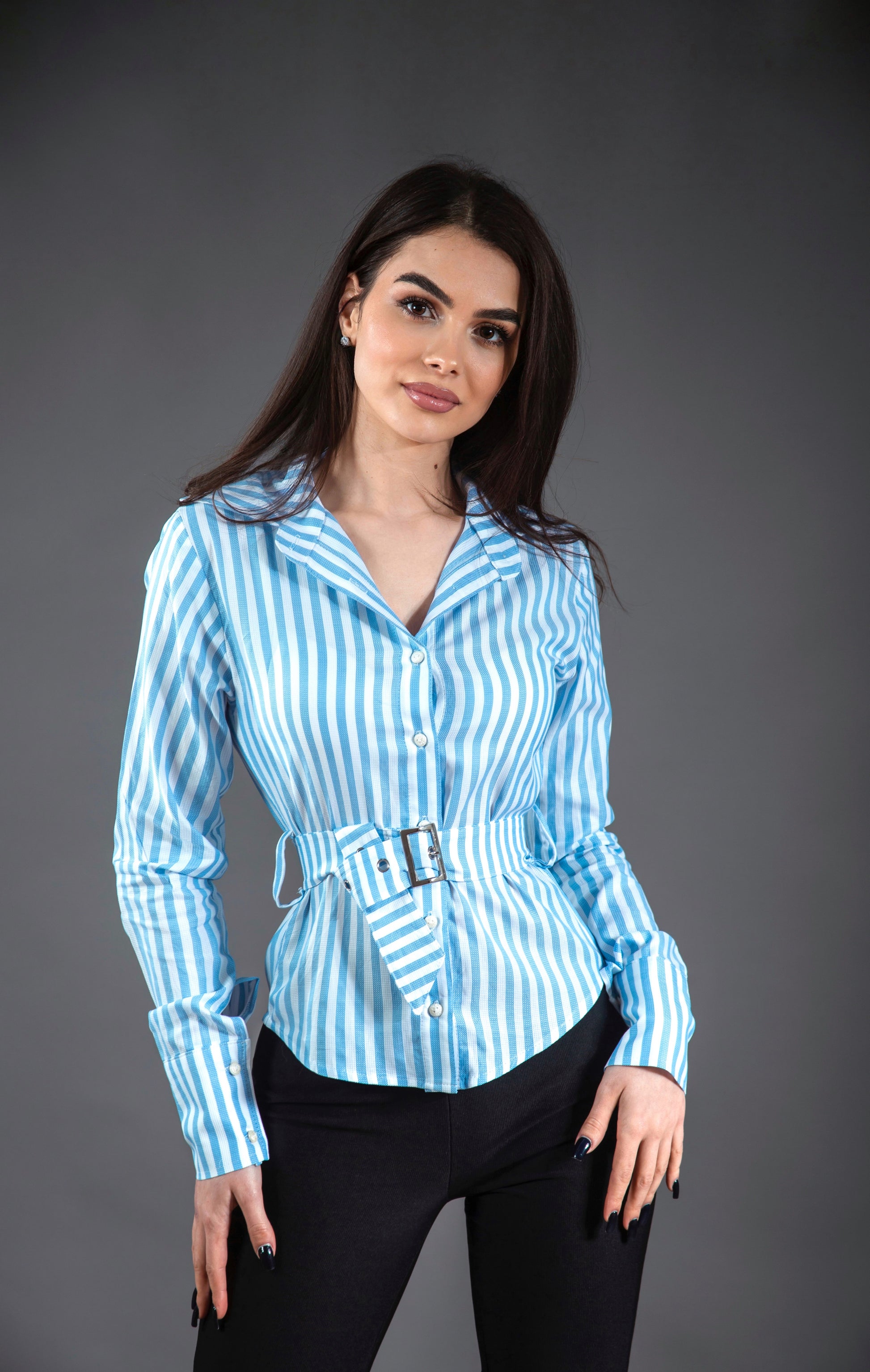 Cămașă cu croială clasică, lungime normală, realizată din material cu dungi alb-albastru deschis. Modelul este completat de curea reglabilă cu cataramă argintie, ce accentuează talia și oferă un look modern. Mâneci lungi.