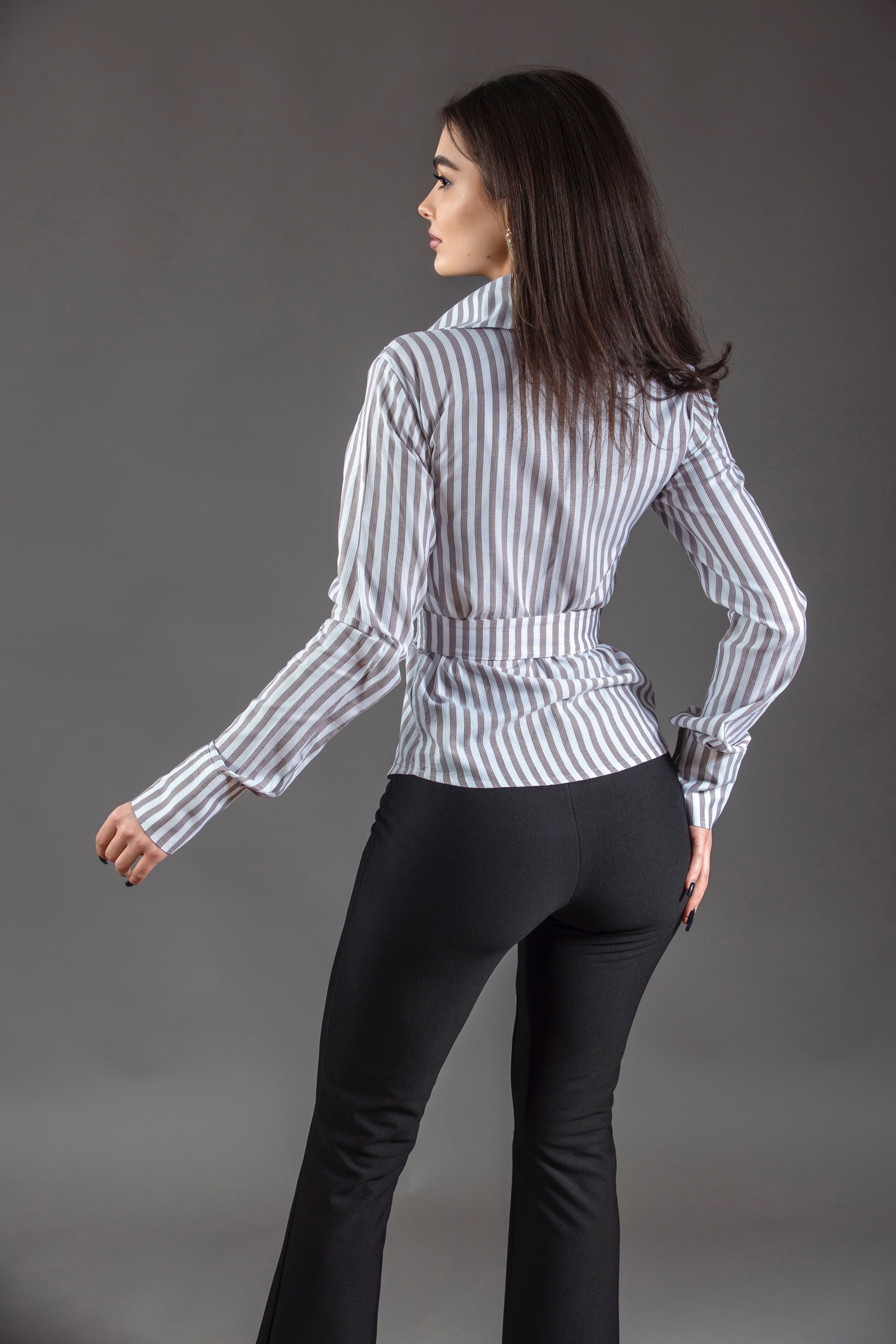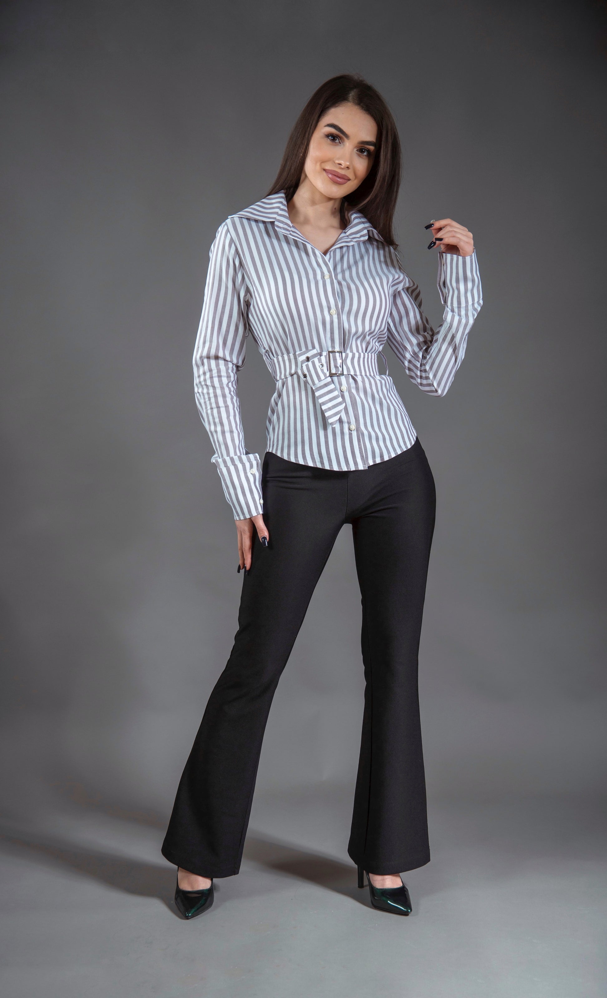 Cămașă cu croială clasică, lungime normală, realizată din material cu dungi alb-maro. Modelul este accesorizat cu curea reglabilă în talie, cu cataramă argintie, ce evidențiază silueta și oferă un aer sofisticat. Mâneci lungi.