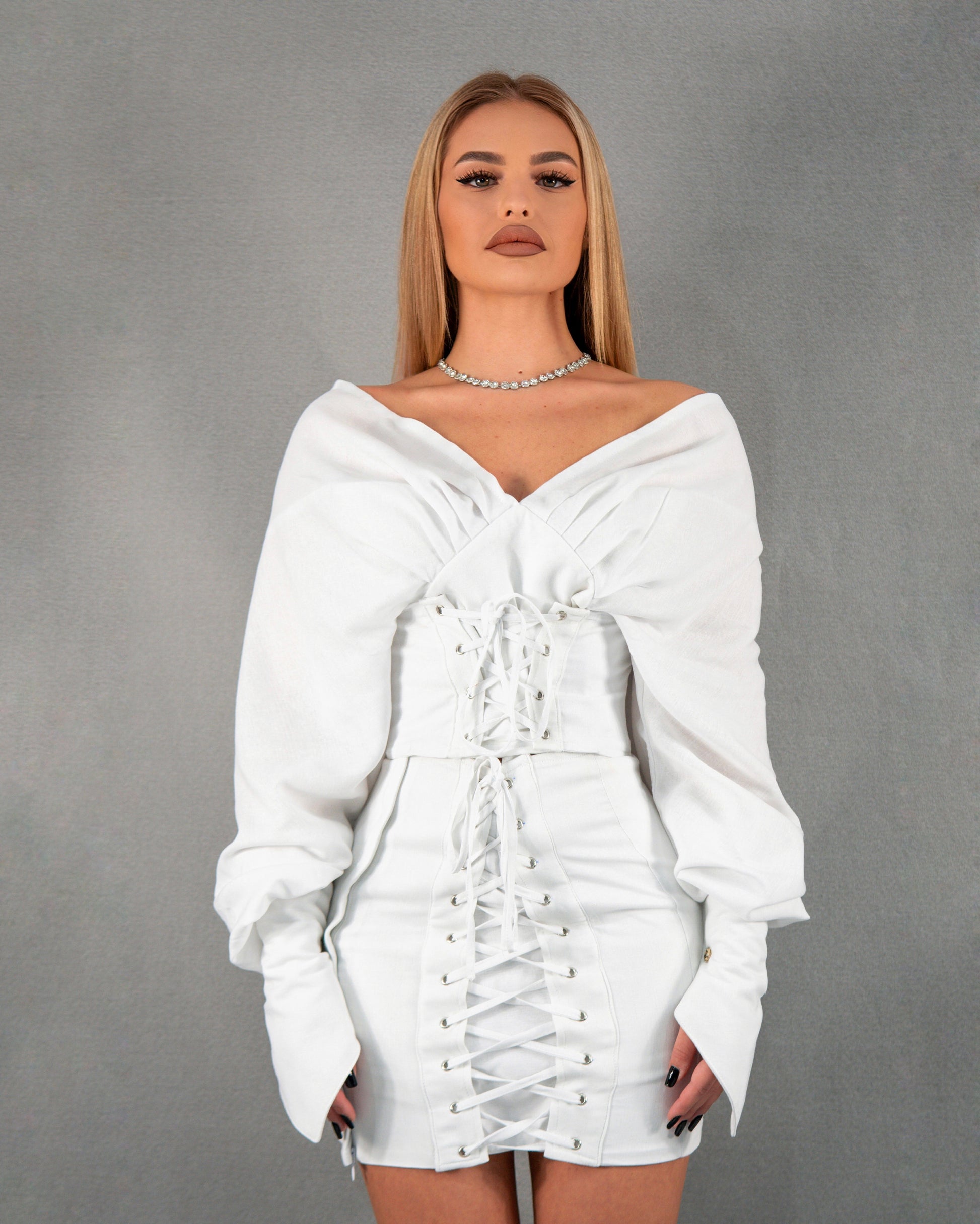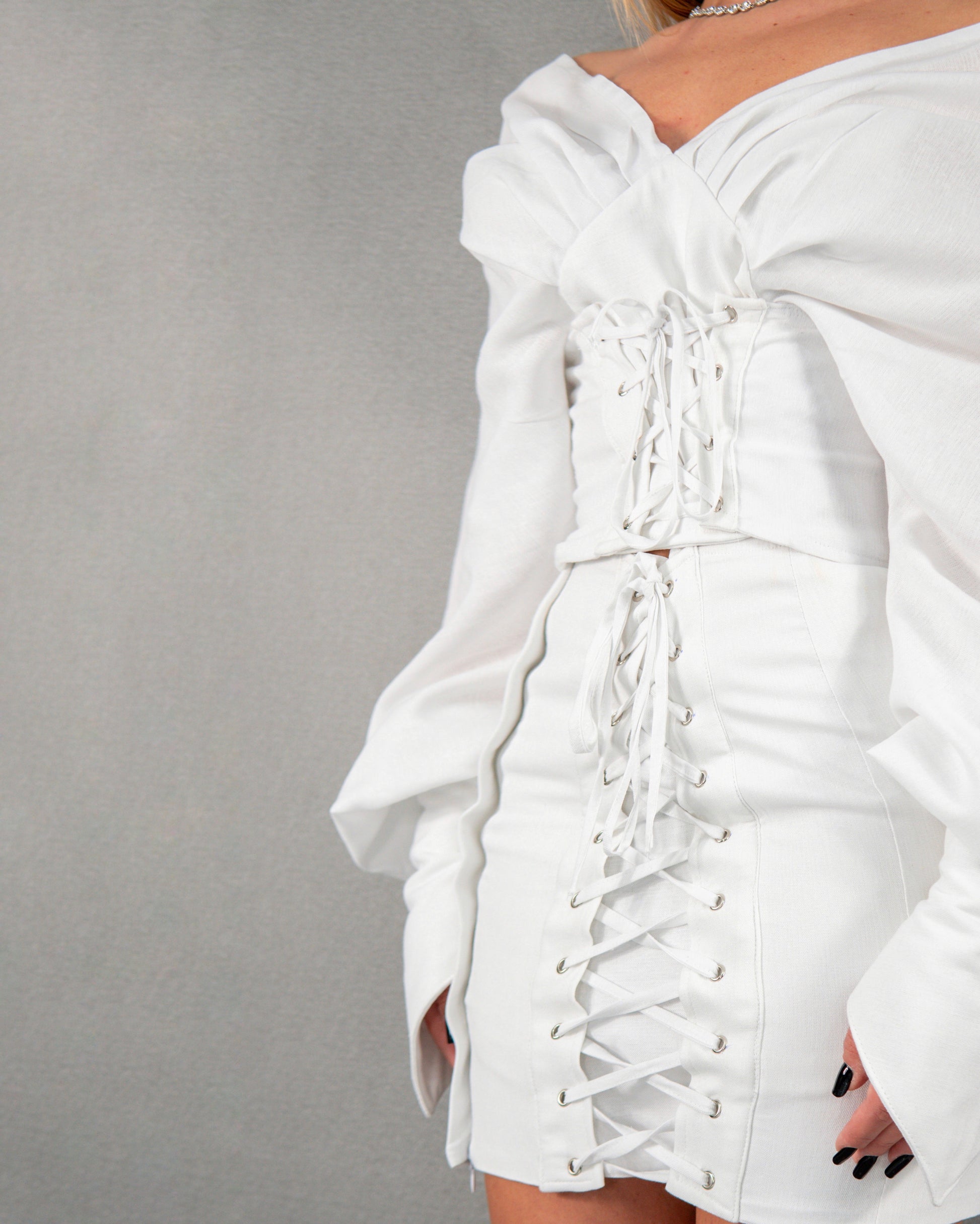 Compleu reglabil din 2 piese, bluză tip corset și fusta cu talie înaltă - alb