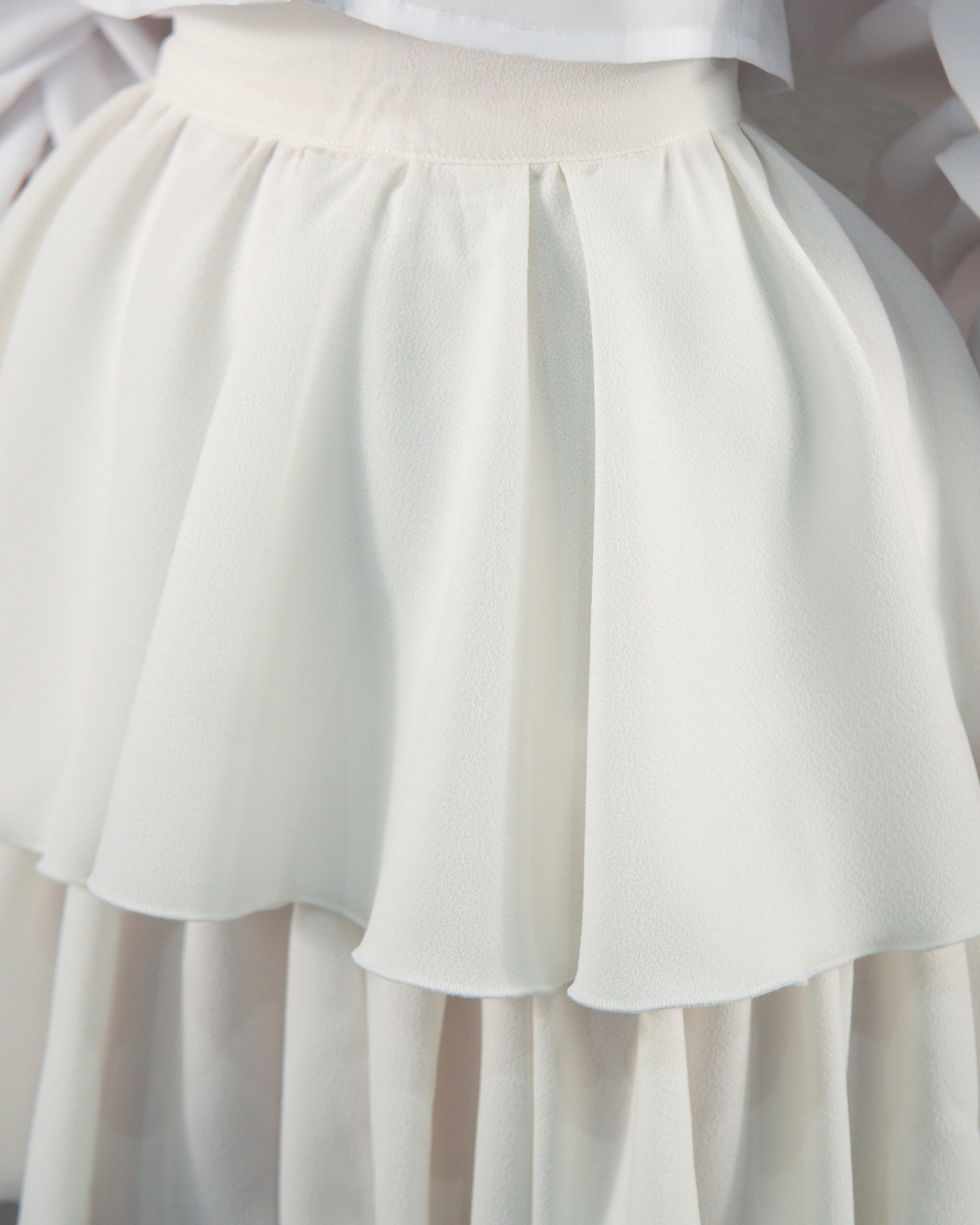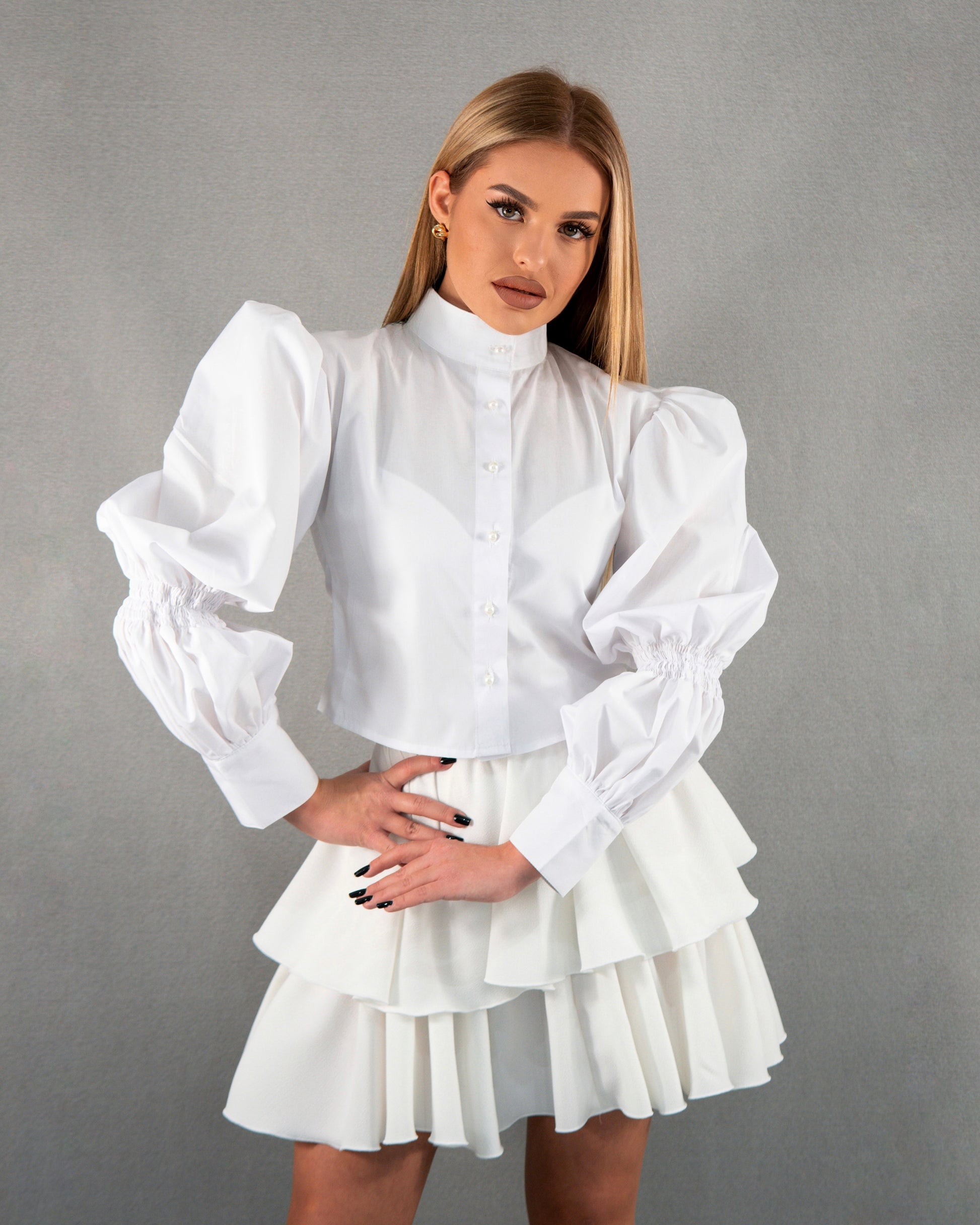 Compleu din 2 piese, cămașă perle cu guler și fusta cu talie înaltă - alb