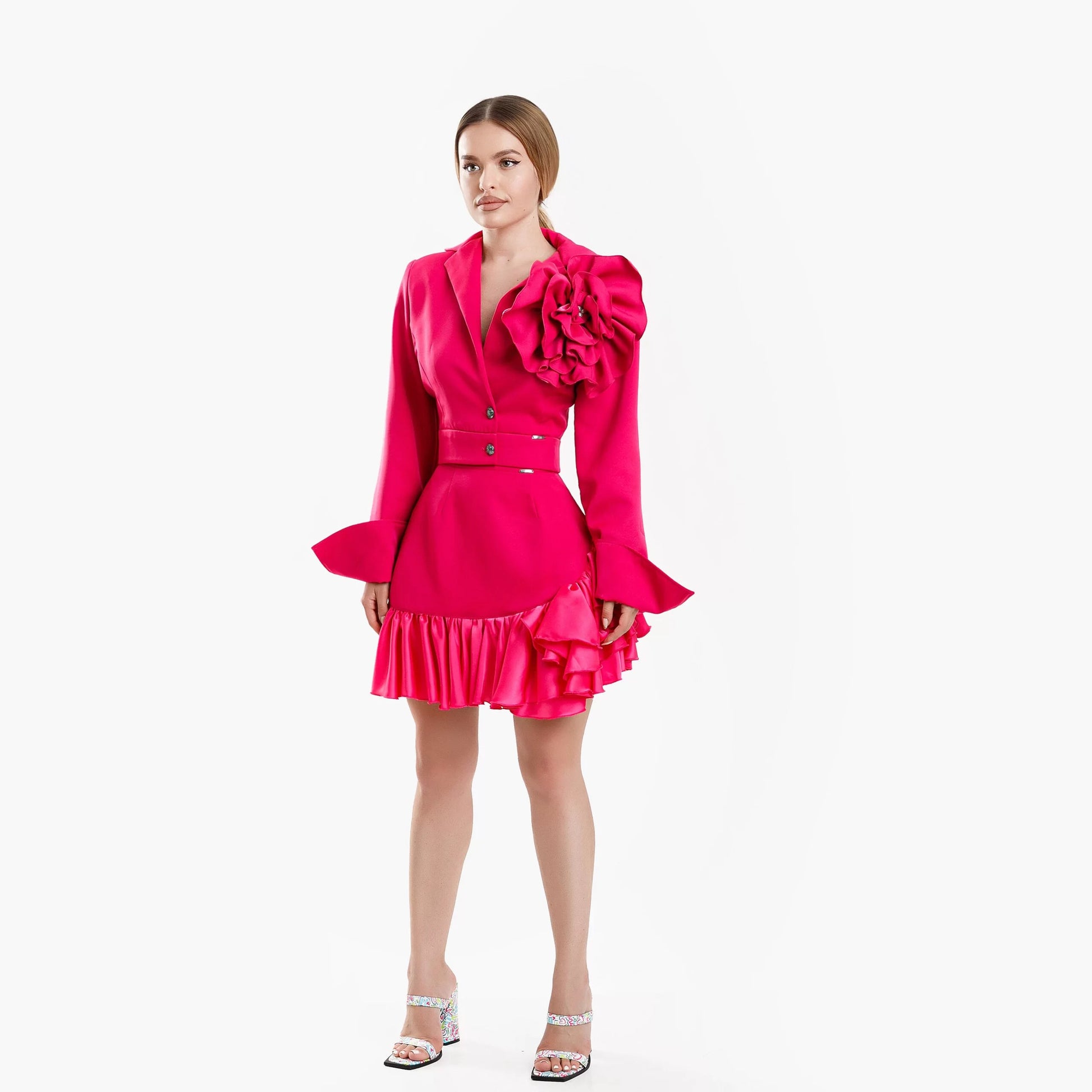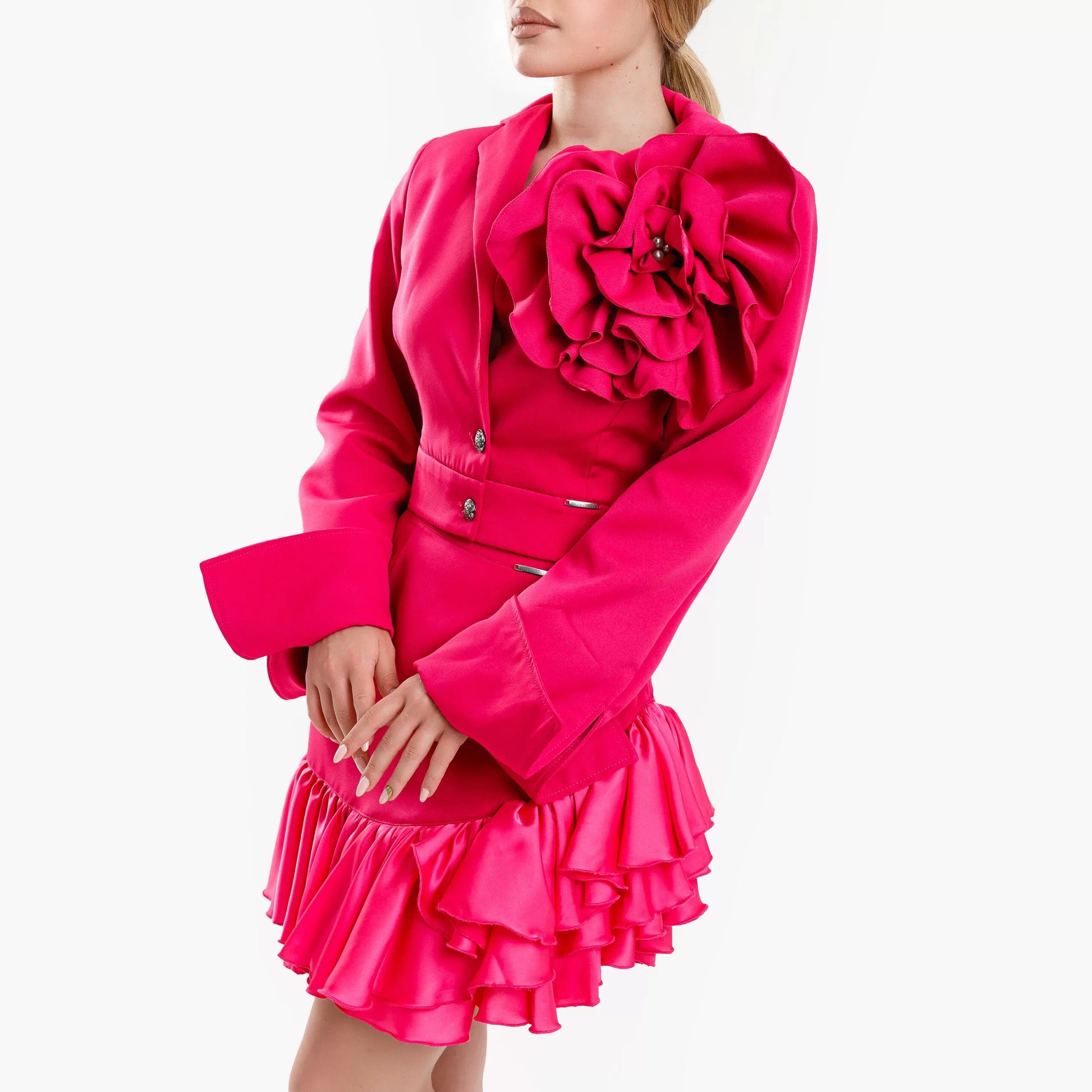 Compleu din 2 piese, sacou cu trandafir detașabil si fusta – roz fucsia