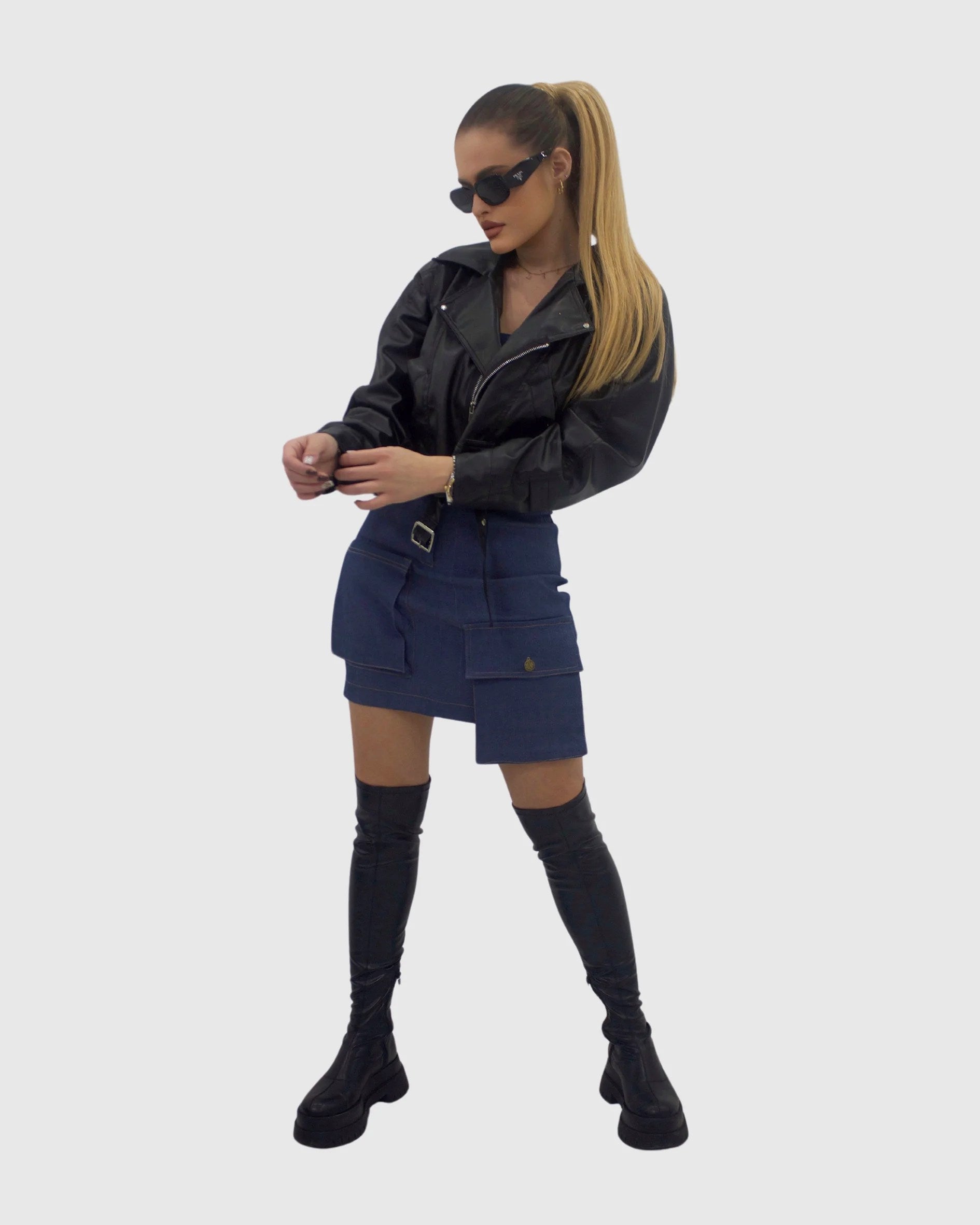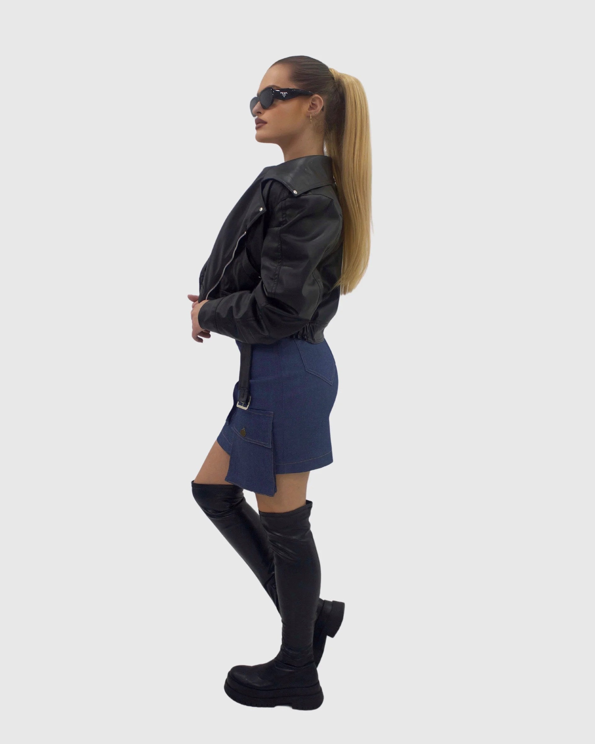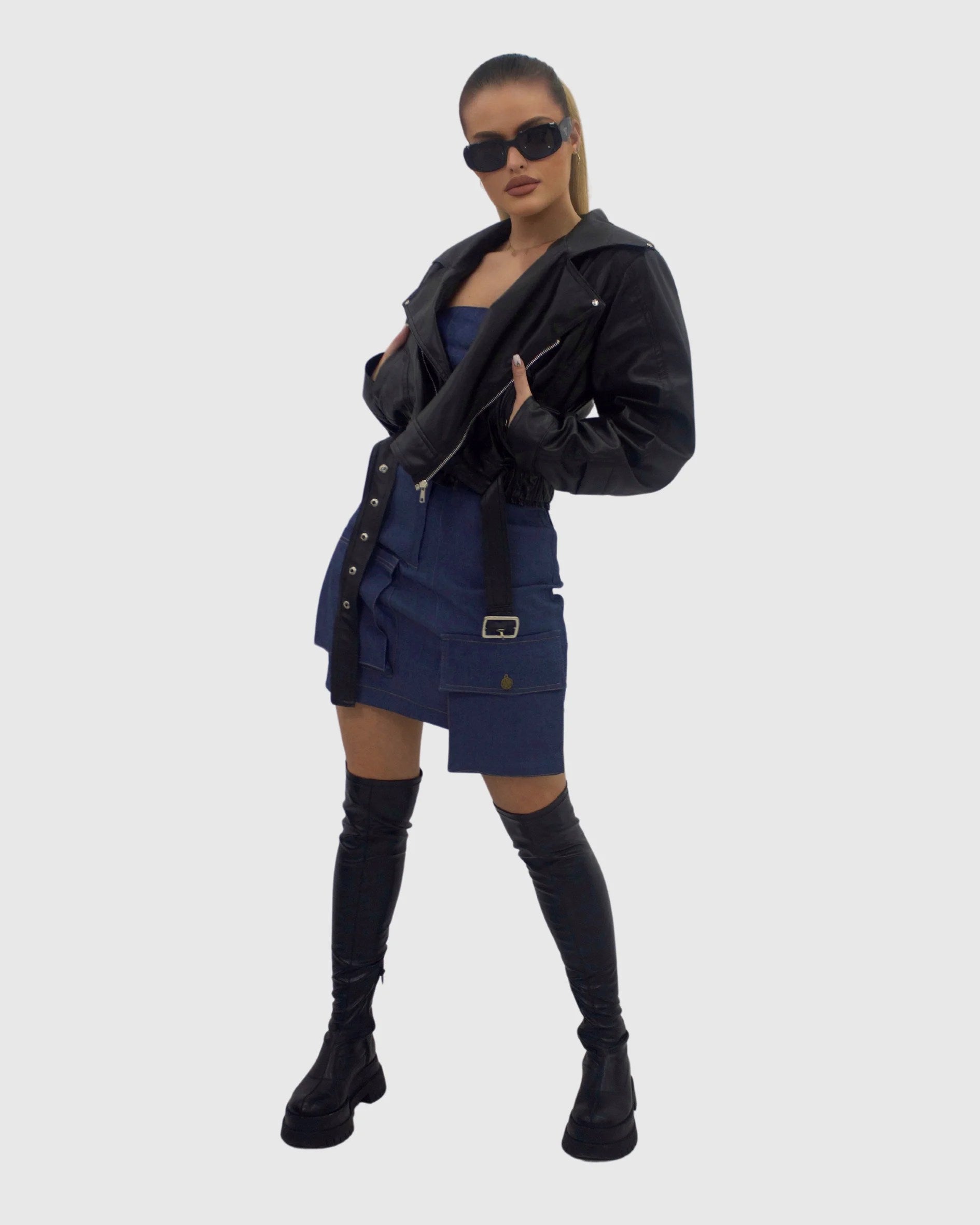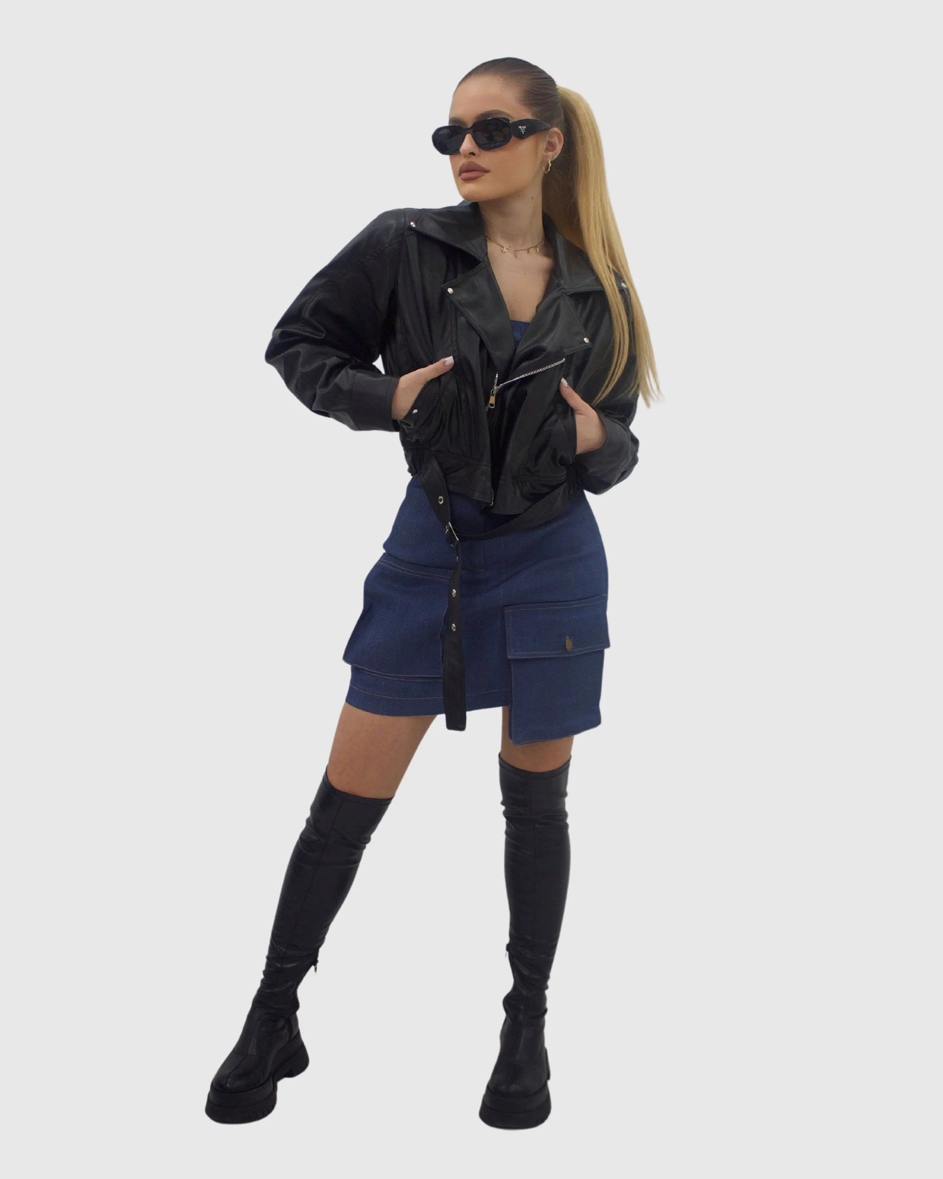 Geacă de piele reglabilă în talie cu buzunare funcționale