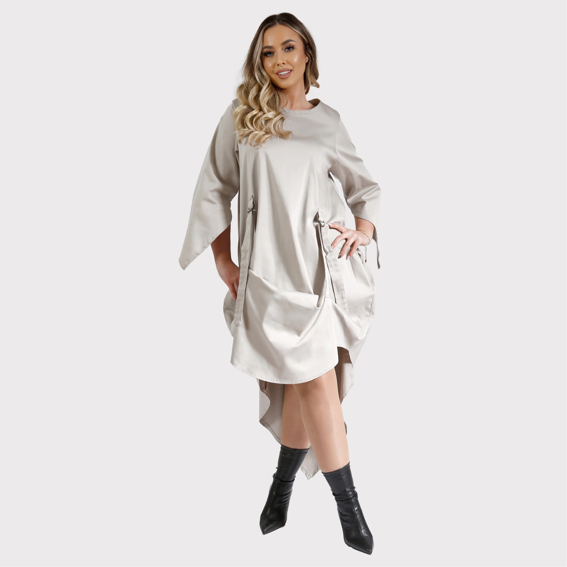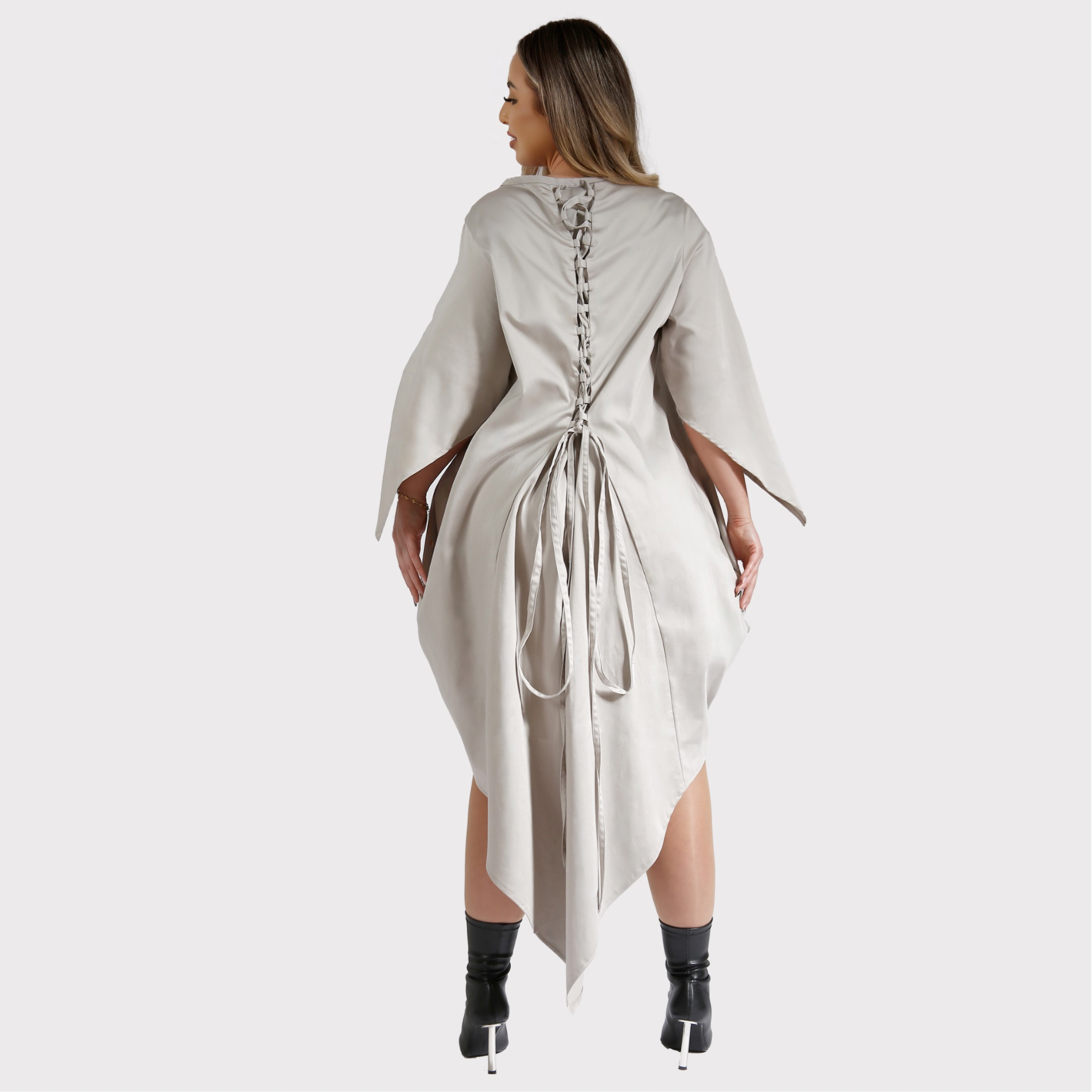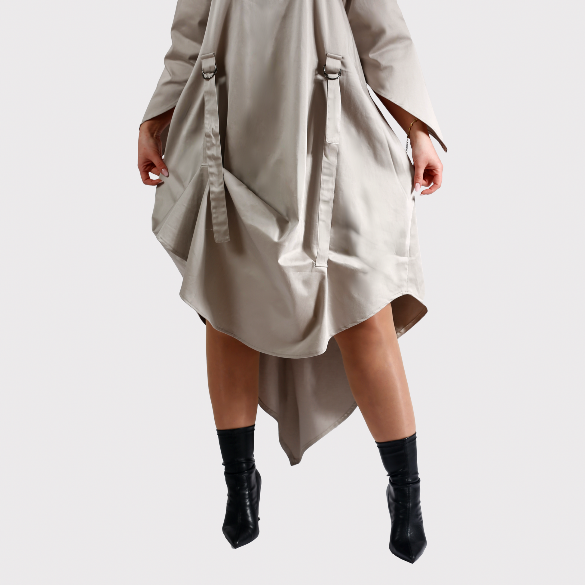 Rochie cu fustă amplă, corset reglabil la spate și catarame laterale care permit ajustarea siluetei. Un design versatil, cu accente boeme și funcționale.