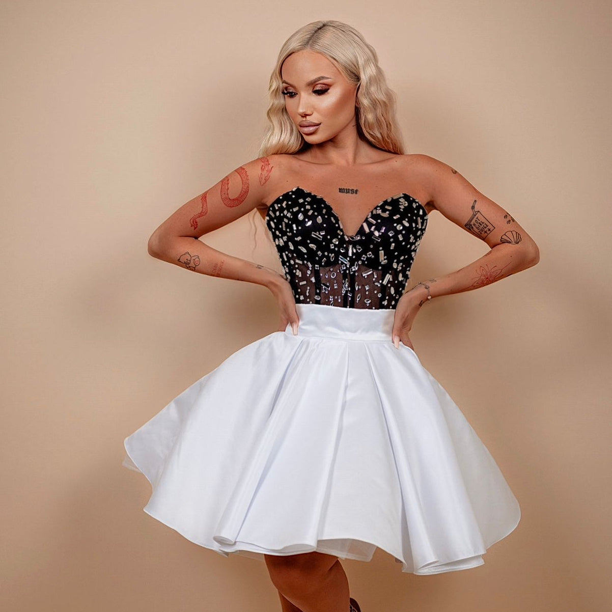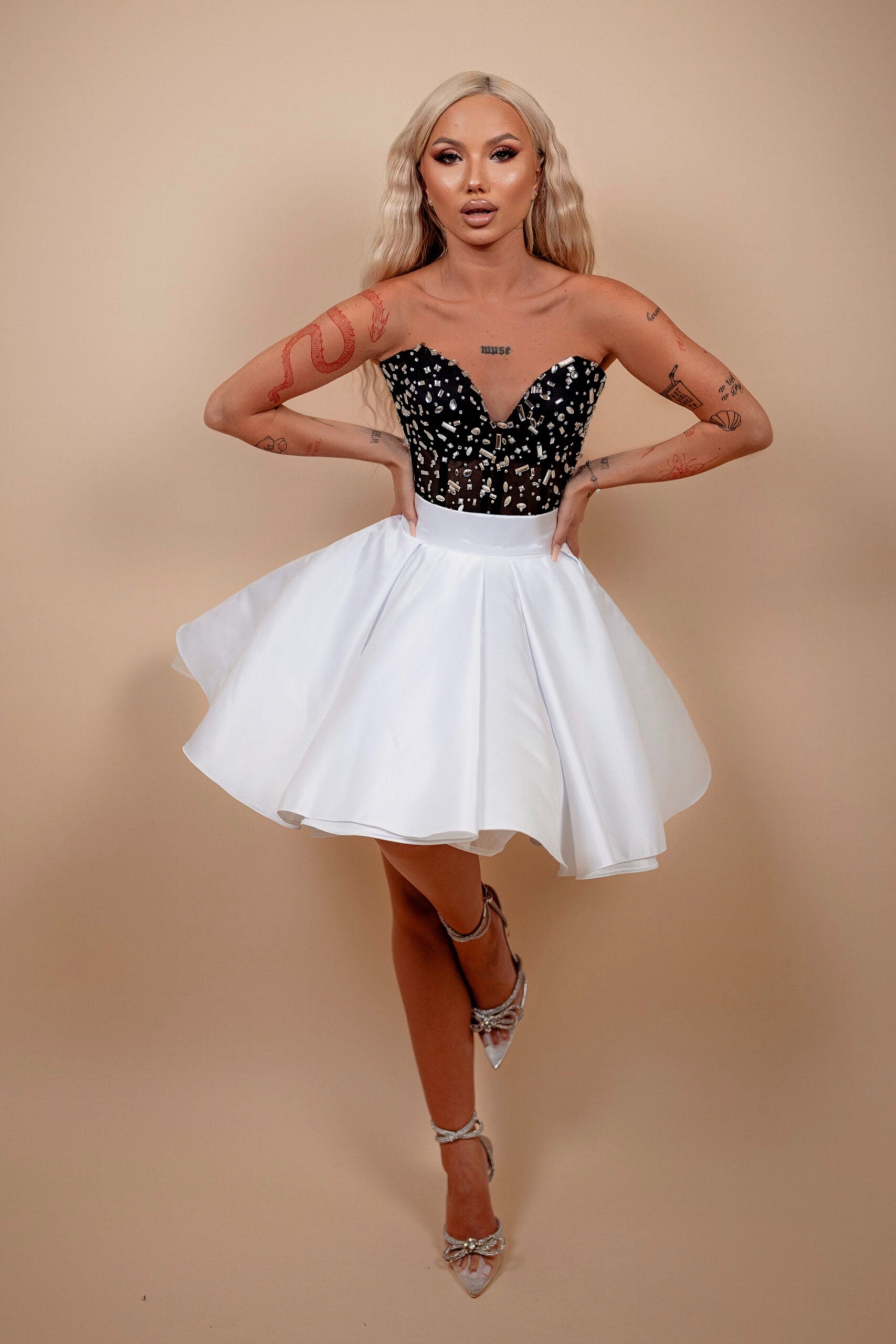 Rochie din 2 piese: corset cu diamante si fusta - alb cu negru