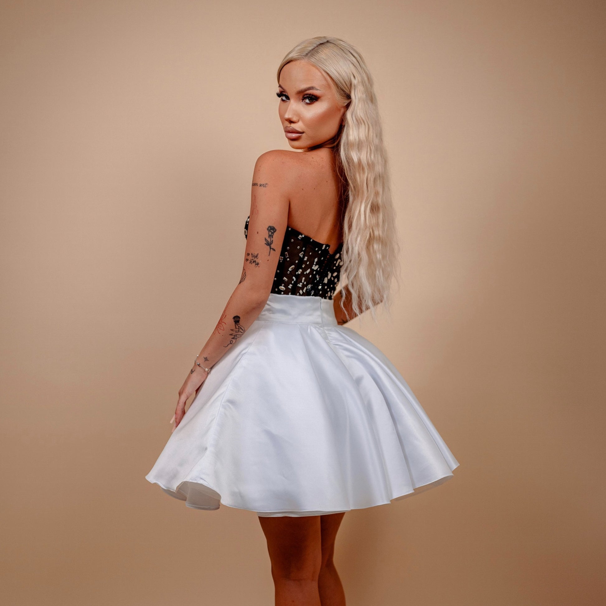 Această ținută elegantă este compusă din 2 piese distincte, îmbinând rafinamentul unui corset negru cu accente strălucitoare și delicatețea unei fuste albe scurte. Corsetul, decorat cu aplicații prețioase, este reglabil la spate, asigurând o potrivire perfectă și o siluetă impecabilă. Fusta scurtă, vaporoasă, din material alb, adaugă un contrast subtil, evidențiind eleganța și modernitatea întregului ansamblu. Această combinație sofisticată este ideală pentru evenimente speciale, aducând un plus de strălucire și feminitate purtătoarei.