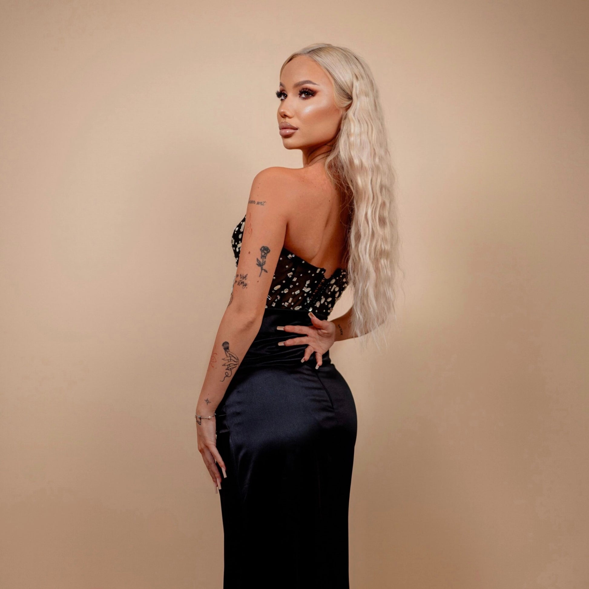 Această rochie elegantă, cu fustă lungă și corset cu plasa si diamante, este o alegere ideală pentru evenimentele de seară. Corsetul, cu un design sofisticat și detalii sclipitoare, se leagă la spate și poate fi purtat peste sau sub fustă, oferind versatilitate în stil. Fusta lungă, realizată din material satinat, cade fluid pe siluetă, conferind un aspect rafinat și grațios. Perfectă pentru ocazii formale, această rochie îmbină eleganța clasică cu un design modern, asigurându-ți o apariție de neuitat.
