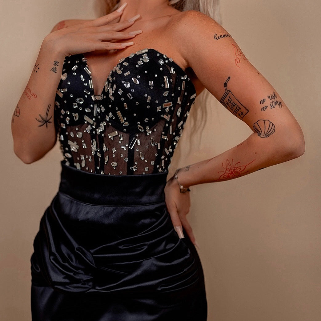 Rochie din 2 piese: corset cu diamante si fusta lunga - negru