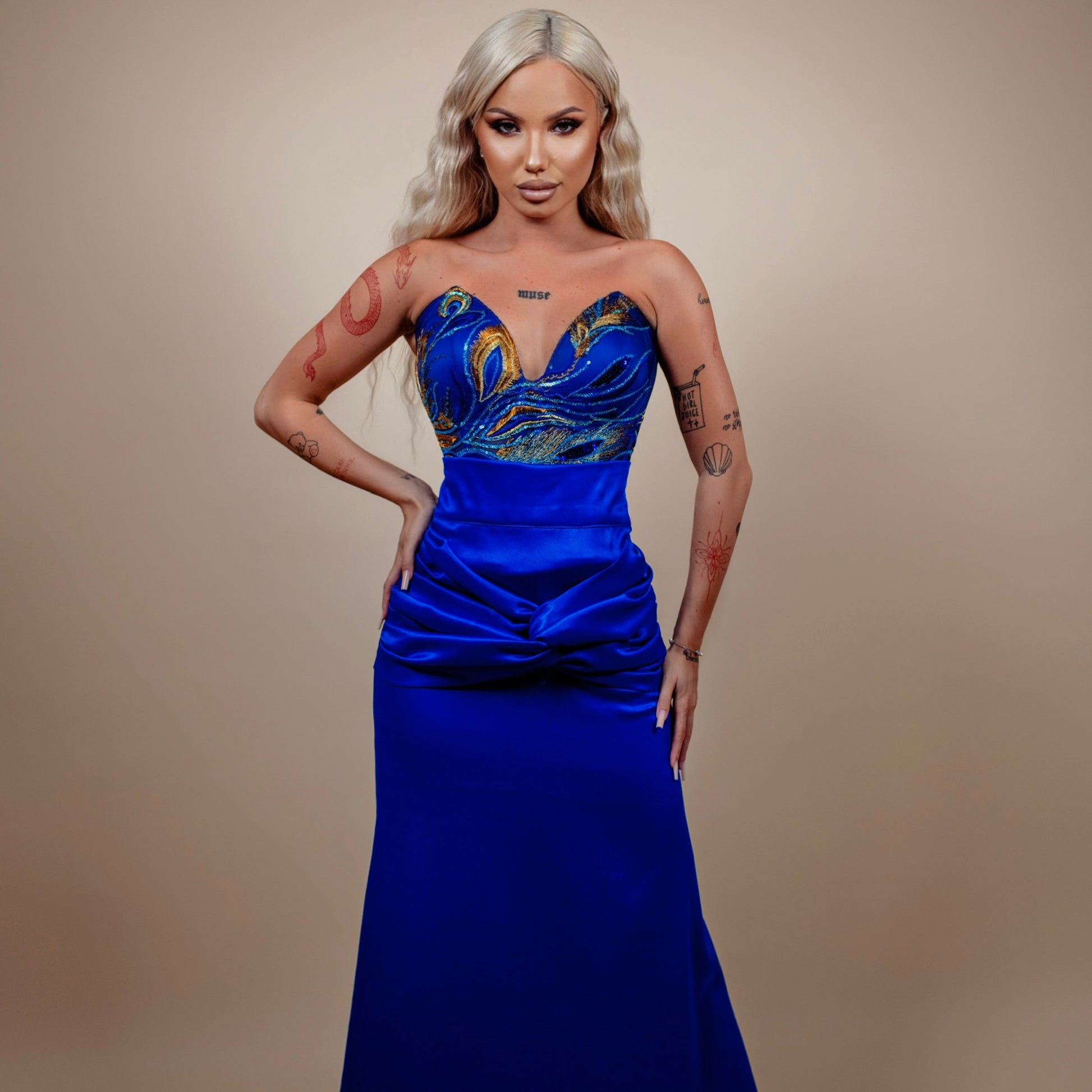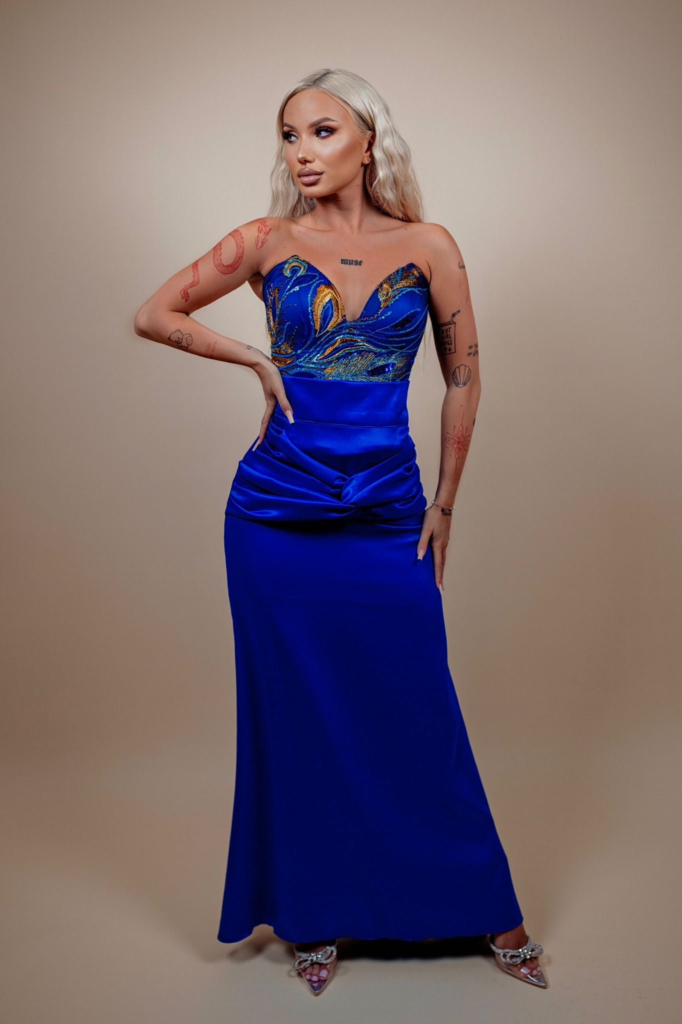 Această rochie elegantă, de culoare albastru regal, este un model unic, format din două piese, potrivită pentru mărimea S. Corsetul mărimea 36, cu un design distinctiv, este decorat cu detalii artistice și se leagă la spate pentru o potrivire perfectă. Poate fi purtat fie peste rochie, fie sub aceasta, oferind versatilitate și stil. Fusta lungă completează ținuta, conferindu-i un aspect sofisticat. Această rochie este ideală pentru evenimente speciale, atrăgând atenția prin designul său rafinat și calitatea materialelor. Perfectă pentru femeile care doresc să se evidențieze cu o ținută deosebită.