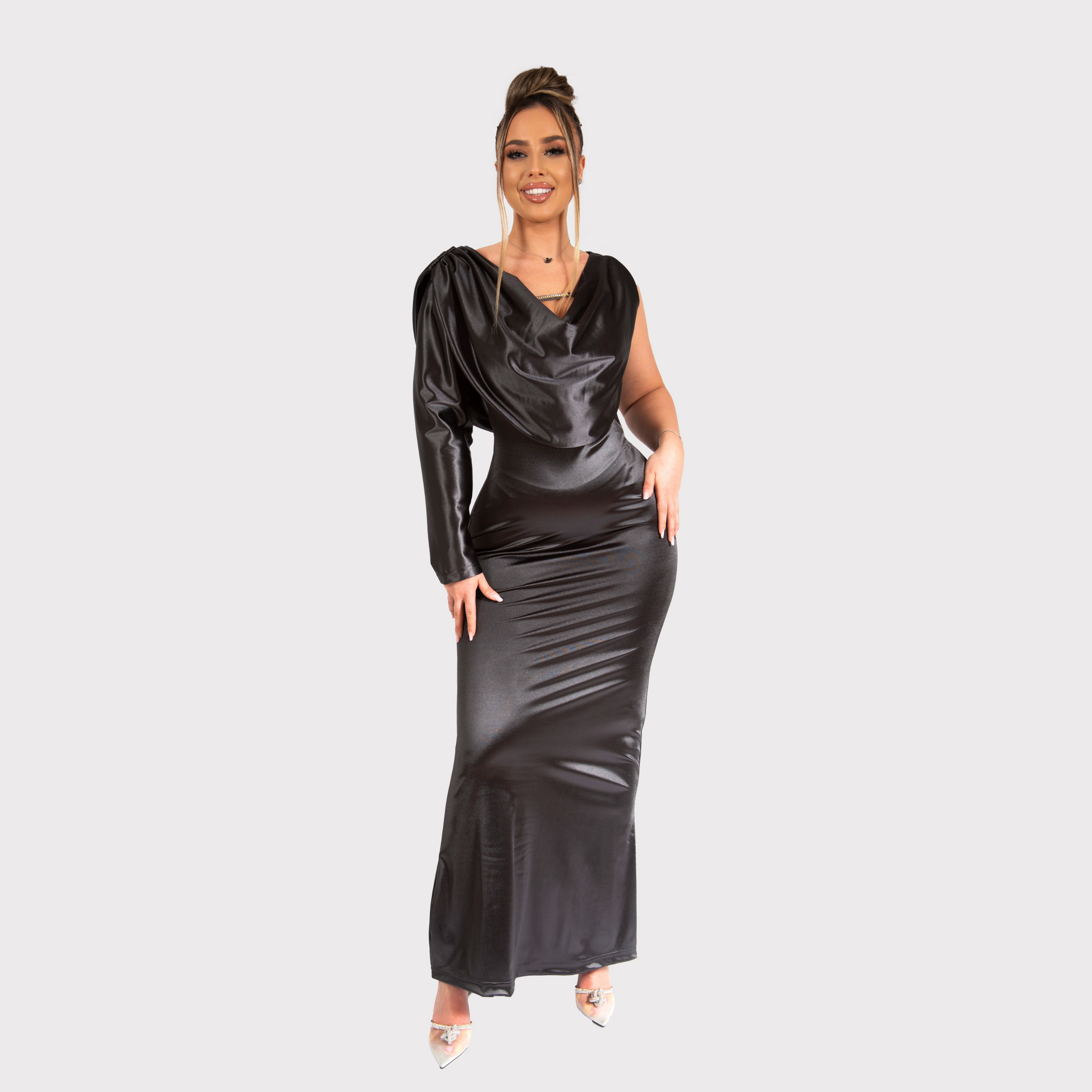 Rochie lungă, mulată, cu mânecă lungă și decolteu drapat – negru lucios