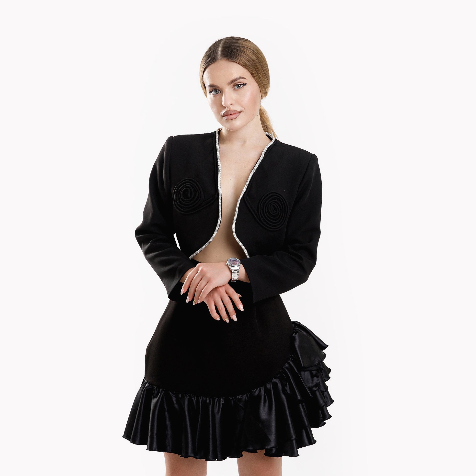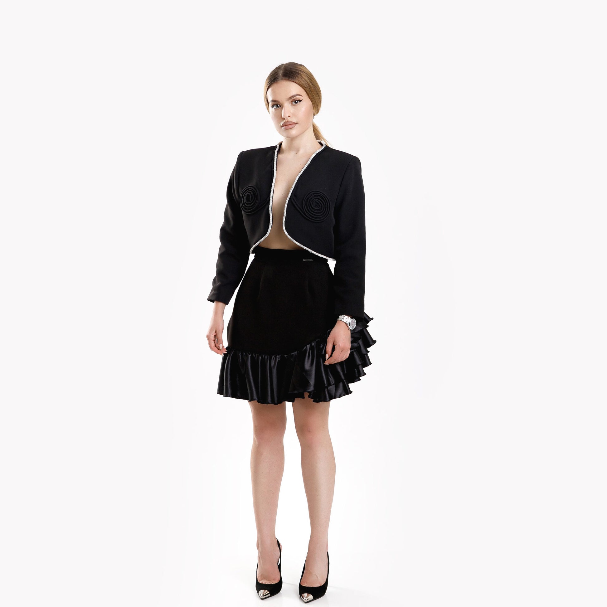 Sacou scurt cu diamante si trandafiri - negru