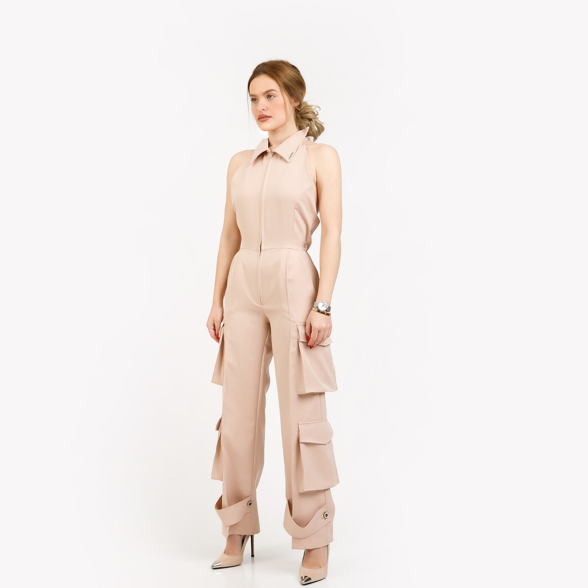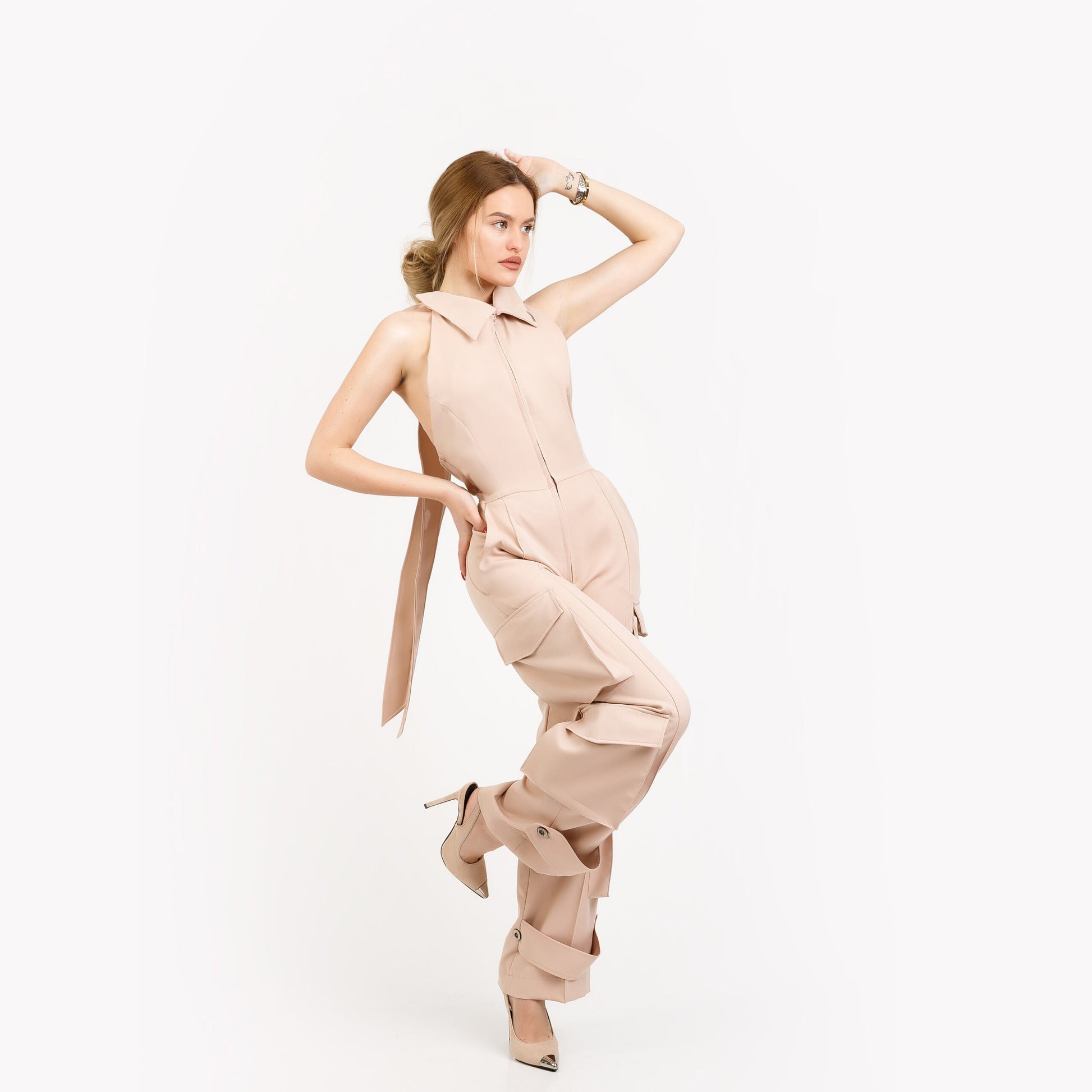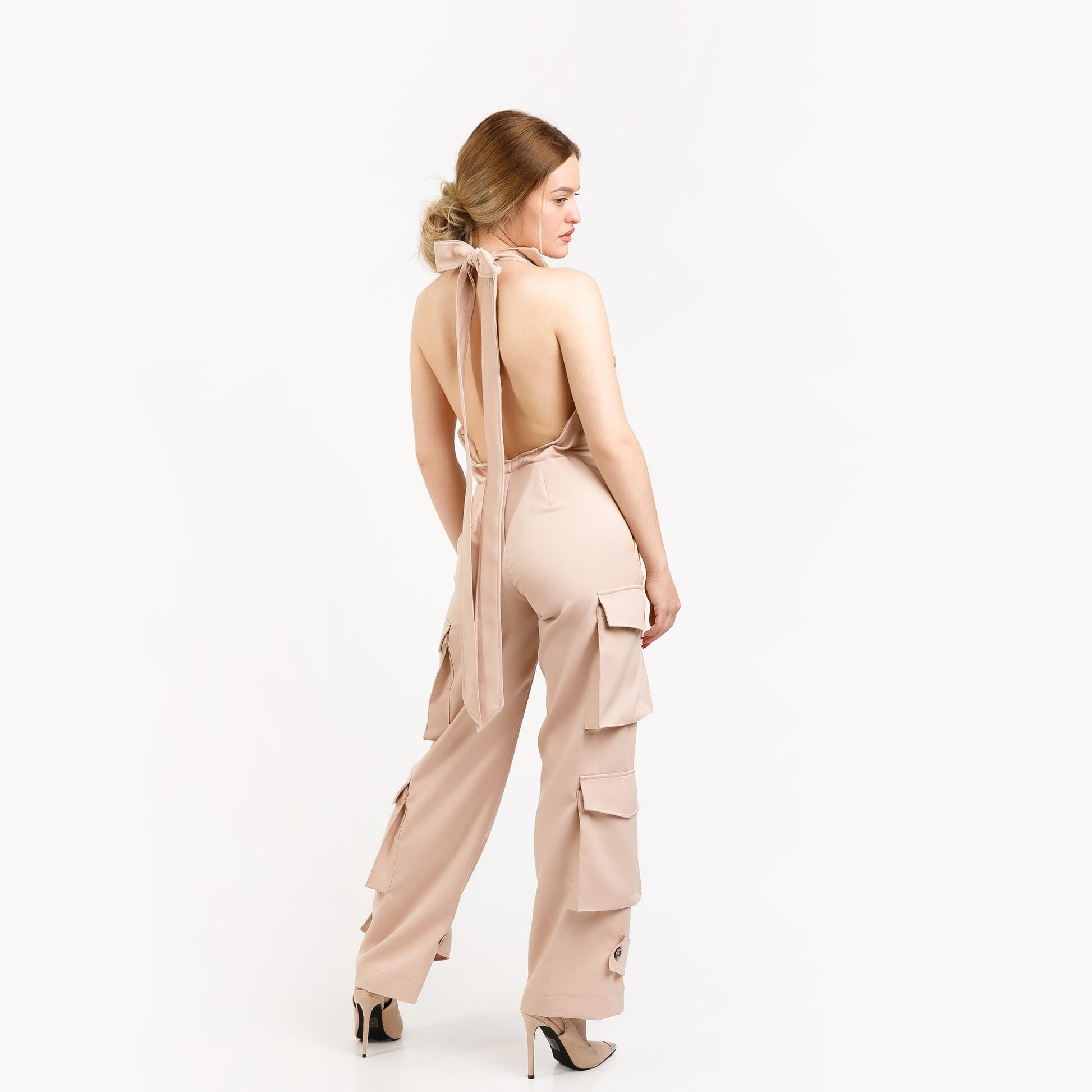 Salopeta casual, cu pantaloni cargo si spatele gol - bej