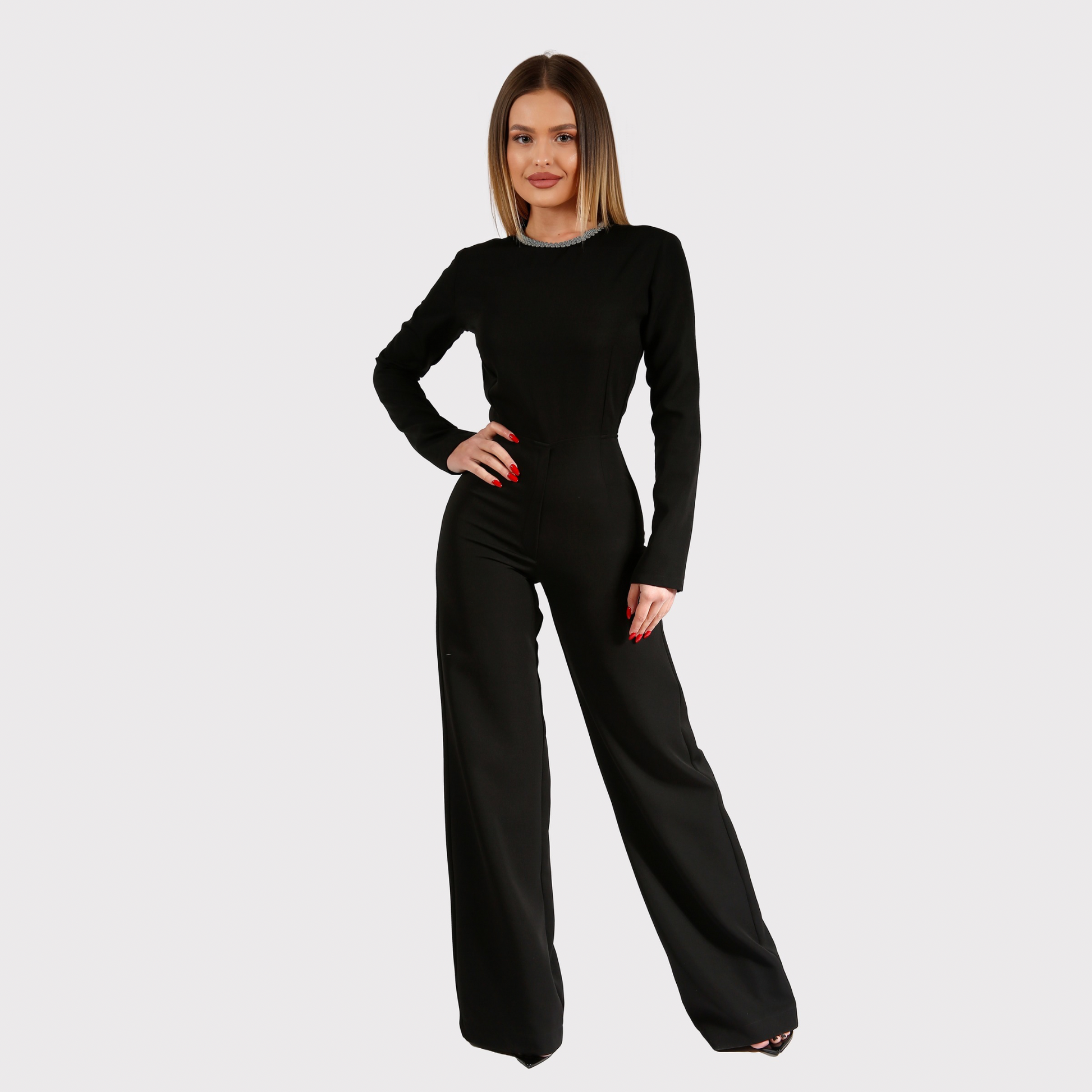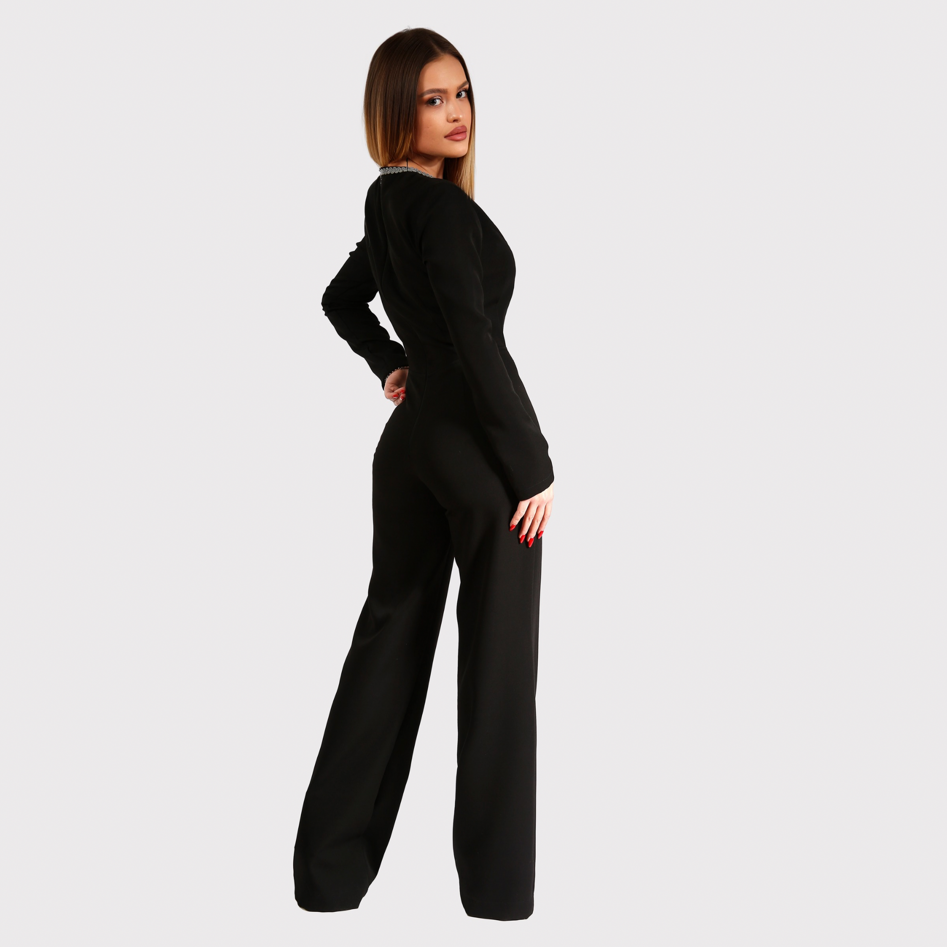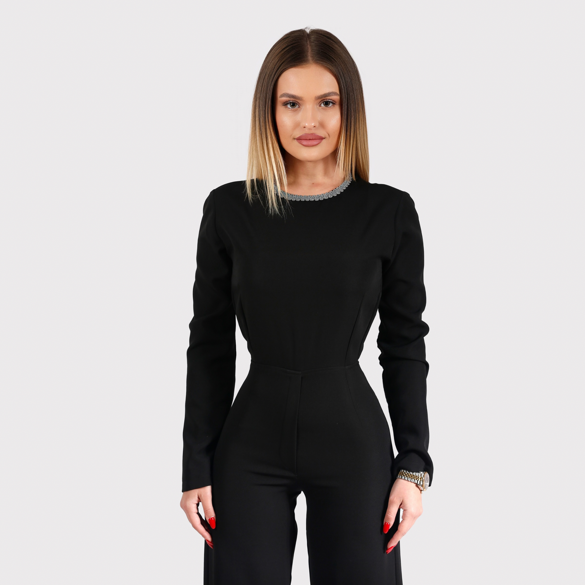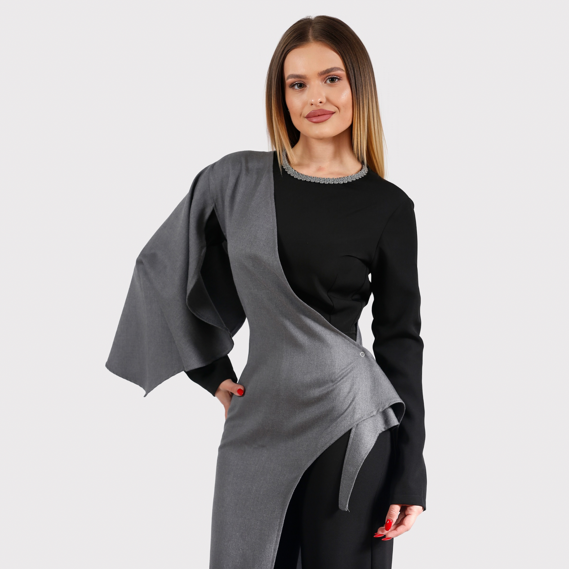 Salopetă neagră elegantă, din material elastic, însoțită de o piesă asimetrică gri tip overlay, prinsă discret la umăr și în talie cu capse. Un look versatil, modern și flatant.