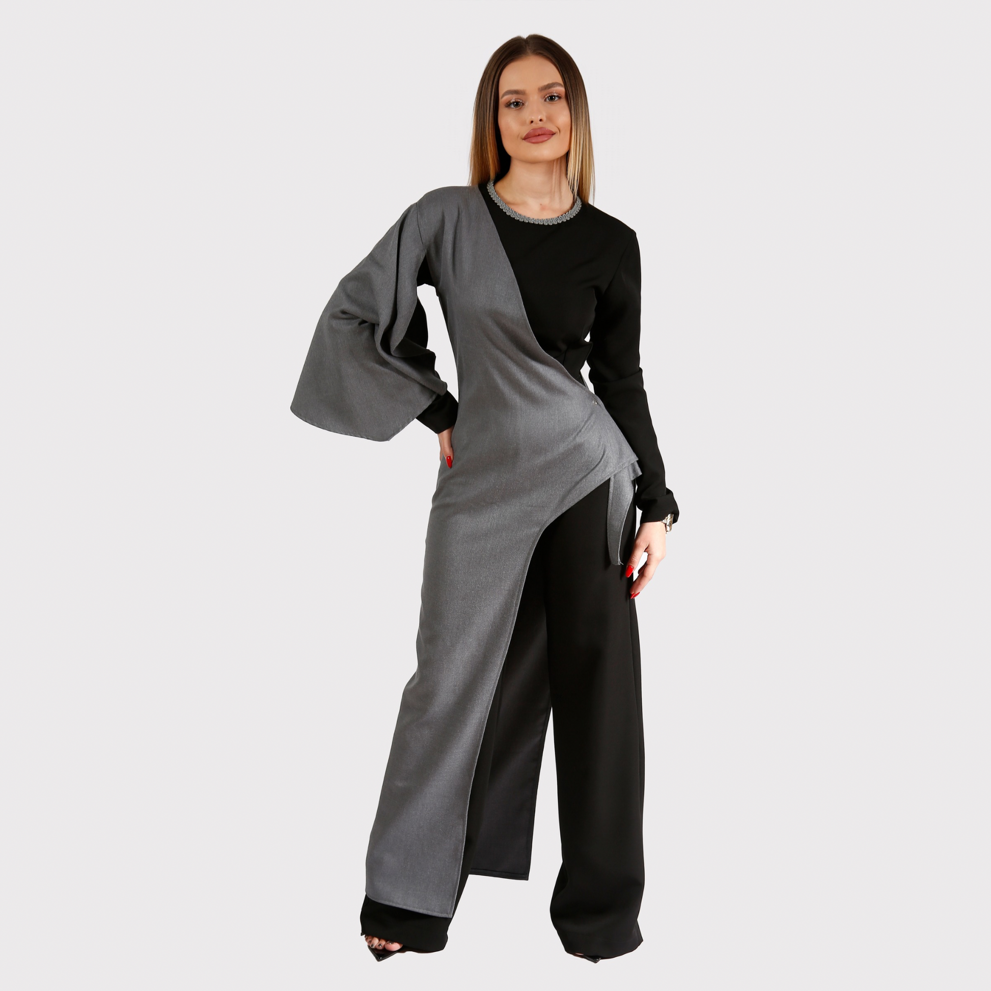 Salopeta din 2 piese, piesă asimetrică gri overlay și salopetă - negru